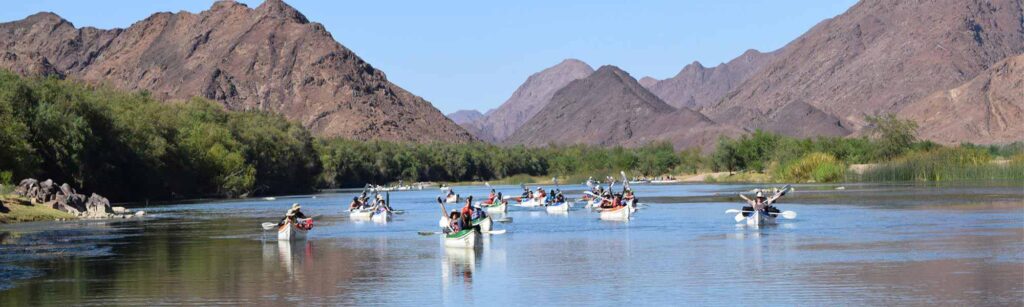 • Oranje River Rafting – Vioolsdrift nach Kanikaip: Im Schlauchboot raften wir den mächtigen Oranje River hinunter. Es geht von Vioolsdrift nach Kanikaip, wo wir mitten im Nirgendwo unser Camp aufschlagen. Stromschnellen, ruhige Passagen, Übernachten direkt am Fluss – Wasser als Kontrast zur trockenen Weite des Richtersveld. Das ist Teamgeist, Spaß und das Gefühl, von der Natur getragen zu werden.